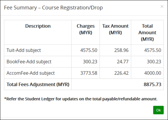 Some institutions provide the option for students to know the fee and charges that will apply for registering or dropping the selected courses. If your institution provides you this option, you can click the View Fee Summary button to view the payable amount details.