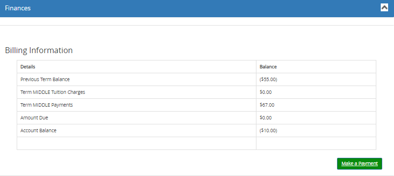 Expand and review the Finances section and select Make Payment to pay your course fees.