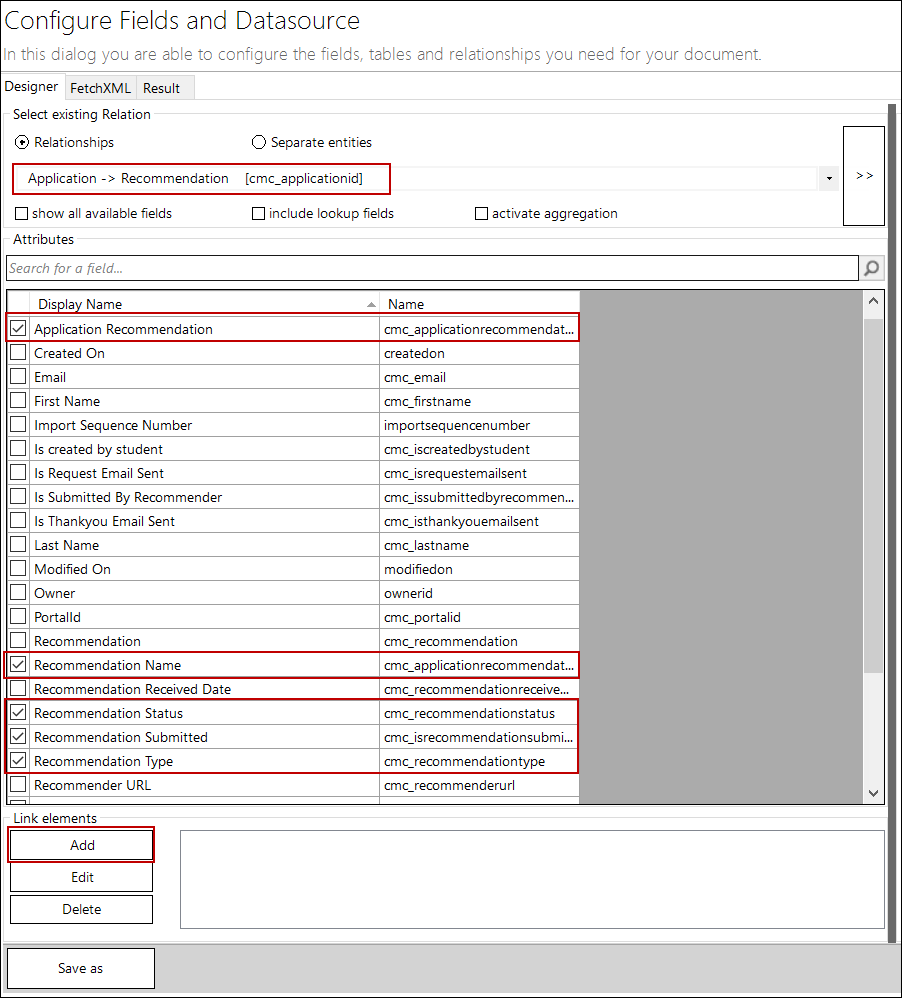In the Select existing Relation area, select Application > Recommendation and select the following fields: - Application Recommendation