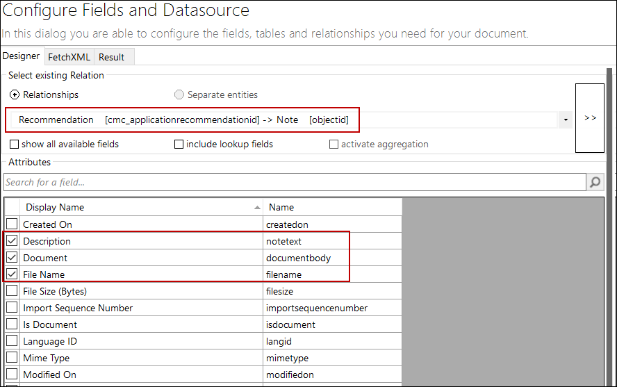 In the Select existing Relation area, select the Recommendation > Note relationship and select the following fields: - Description