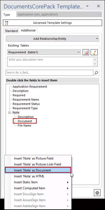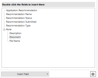 Under the Note field, select Document, click the Insert Field drop-down, and select: - Insert 'Note' as Document to include the attachment as a document, or
