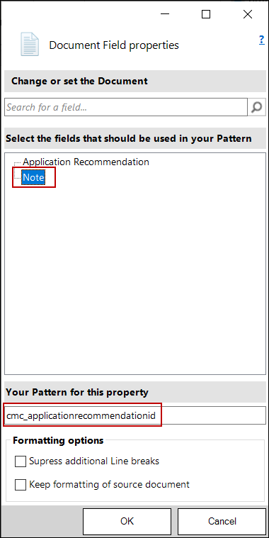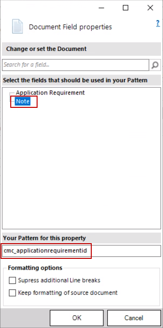 In the Document Field properties, double-click Note. The pattern for the Note field is displayed.