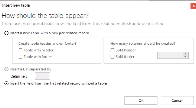 Click through OK twice. The selected fields from the entities are added in the area above the Insert Field drop-down button as shown in the following image: