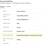In Anthology Reach, in the field mapping record of the custom field to which the extended property is mapped, update the value of the External Field Name as ExtendedProperties[Name=Extended Prop1].Value. In the specified value, ExtendedProp1 is the name of the extended property in the JSON array.