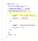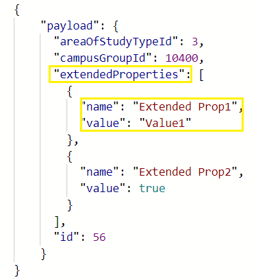 The following is an illustration of the JSON payload for extended properties to be sent from Anthology Reach to Anthology Student.