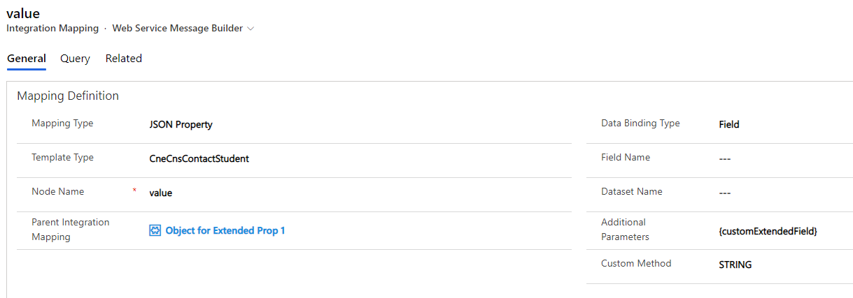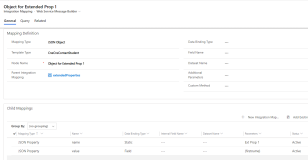 In the extendedProperties Integration Mapping record, for each extended property, create a child mapping record with Mapping Type as JSON Object to store the details of the extended property.