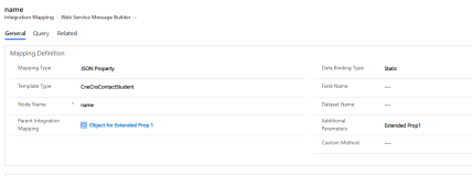 For the payload Integration Mapping record of the entity to which extended properties must be added, create a child integration mapping record, extendedProperties, and set the value of the Mapping type as JSON Array.