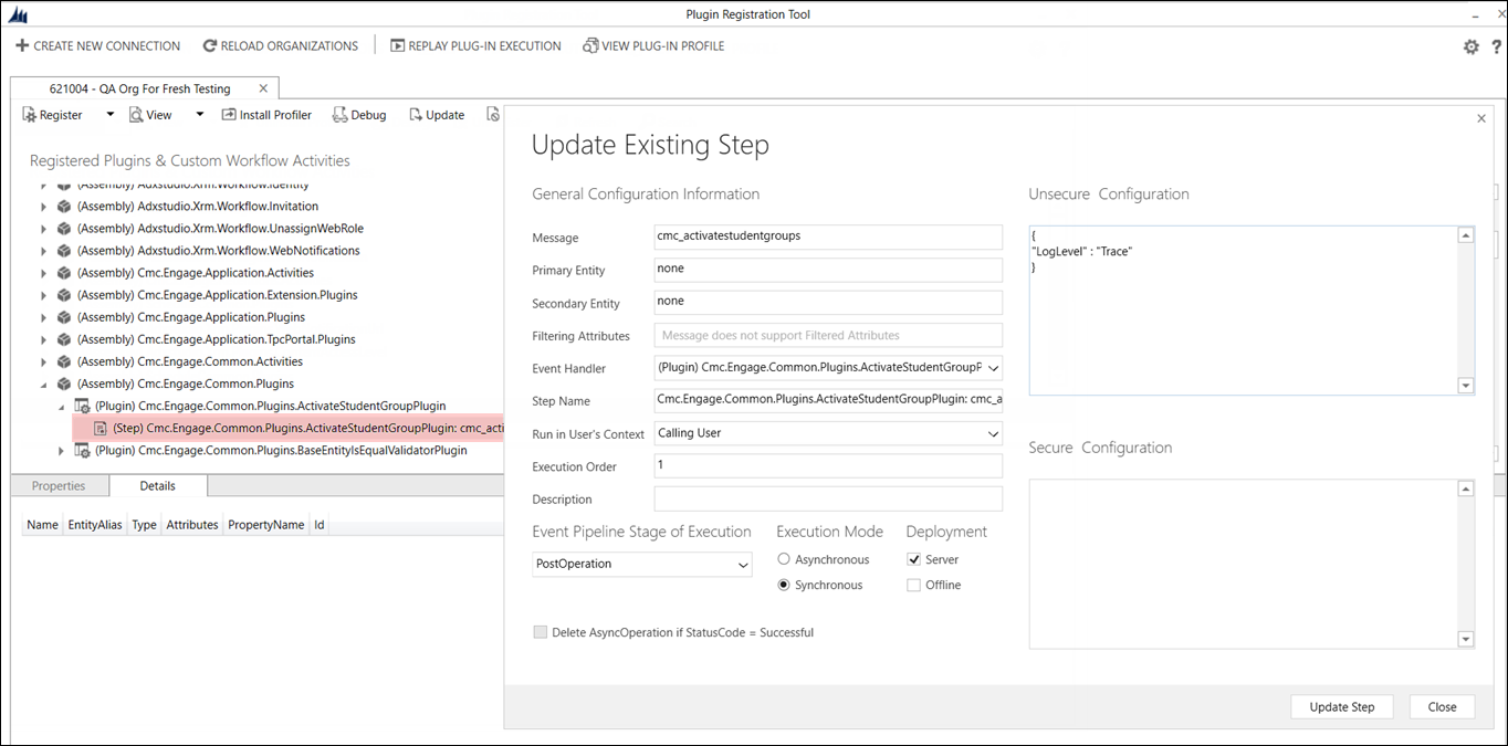 The unsecured configuration of a plug-in is available while viewing its registration details in the Plug-in Registration Tool.