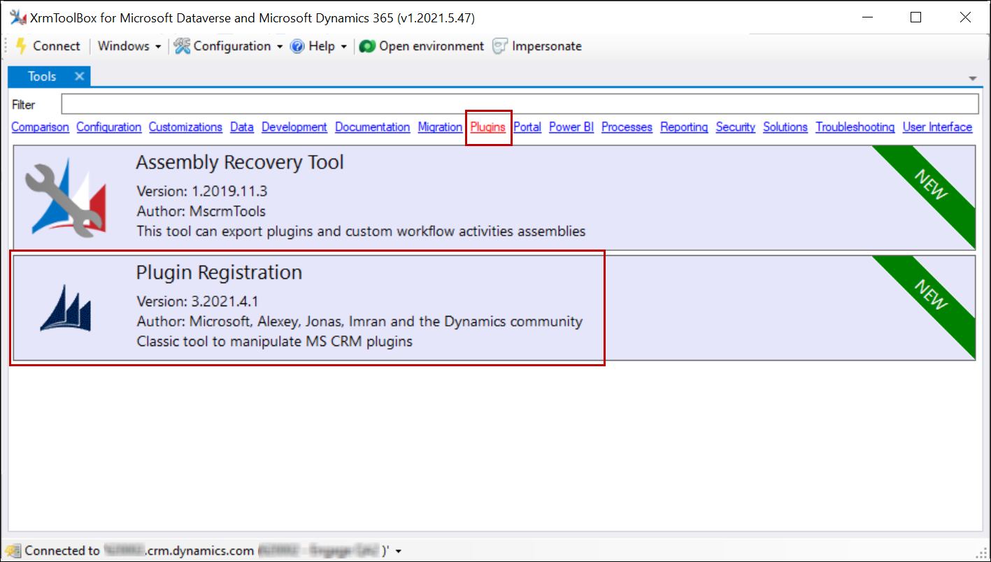 The Plugin Registration tool from the XrmToolBox Tool Library is installed.
