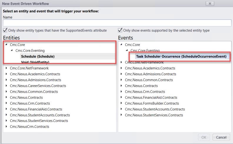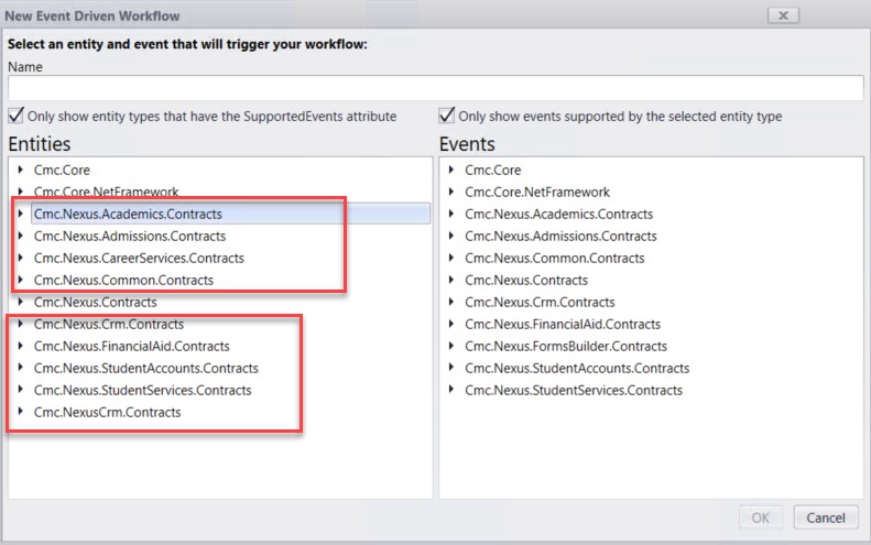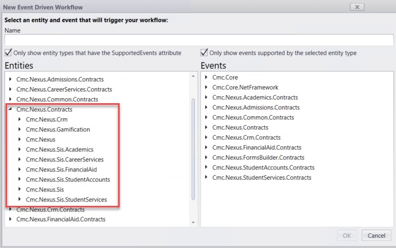 The V1 Contracts are referred to as the "old namespacing" before the Nexus re-architecture occurred. These Contracts are listed under Cmc.Nexus.Contracts. All workflows created using the V1 Contracts and Event of type Saved will always use the Service Module Host. The triggers for V1 saved events are at the database level so such workflows will be executed whether ‘Save’ is performed on Web Client, Anthology Student (Desktop Client), or CampusLink.
