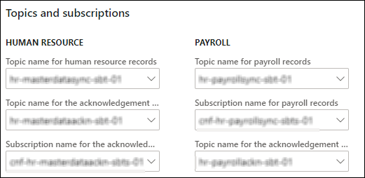 6. Expand the Topics and subscriptions FastTab to configure the Azure Service Bus topics and subscription names for human resource and payroll data.