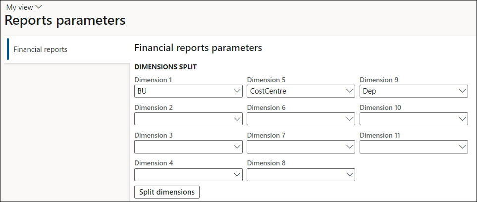 The financial dimensions combination fields can be split into separate fields using the Split dimensions batch job available in the Financial reporting parameters page (under Student accounting > Setup > Reports parameters).