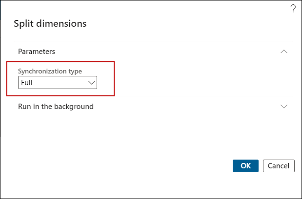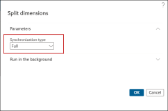 Note: Select Full in the Synchronization type field when the Split dimensions batch job is run for the first time, and every time the dimensions are updated in the Dimensions Split section. After the Split dimensions batch job has been already run and the dimensions were not updated tin the Dimensions Split section, select Incremental in the Synchronization type field.