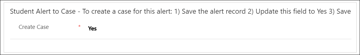 In the student alert form, to create an associated case when saving the student alert record, set the value of the Create Case field to Yes. By default, its value is No.