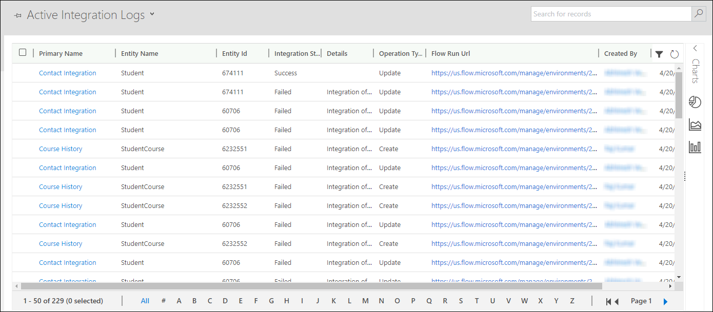 For each integration operation, a record of the Integration Log entity is created, It indicates the status of the integration in the Integration Status field with the values Success or Failed.