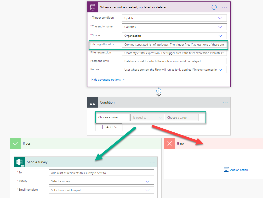 The required logic to send this survey would use an asynchronous flow that triggers when a contact record is updated if the update is on a field listed in the filtering attributes. A condition check is done on the field to determine if it meets the criteria to send out the survey. The green arrow indicates the survey is sent, and no further actions happen if the criteria are not met (red arrow).