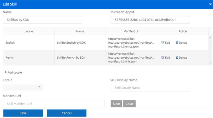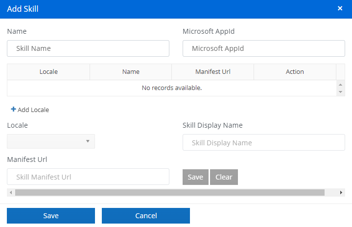 | Clear/Save | The Clear and Save buttons on the right side of the Manifest Url field apply only to the settings in the Locale section of the Add/Edit Skill forms. |