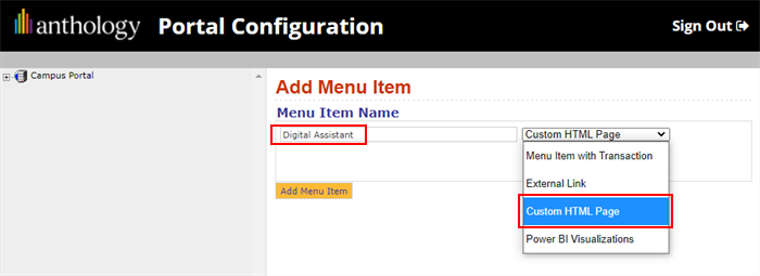In the Menu Item Name drop-down list, select Custom HTML Page and click Add Menu Item.